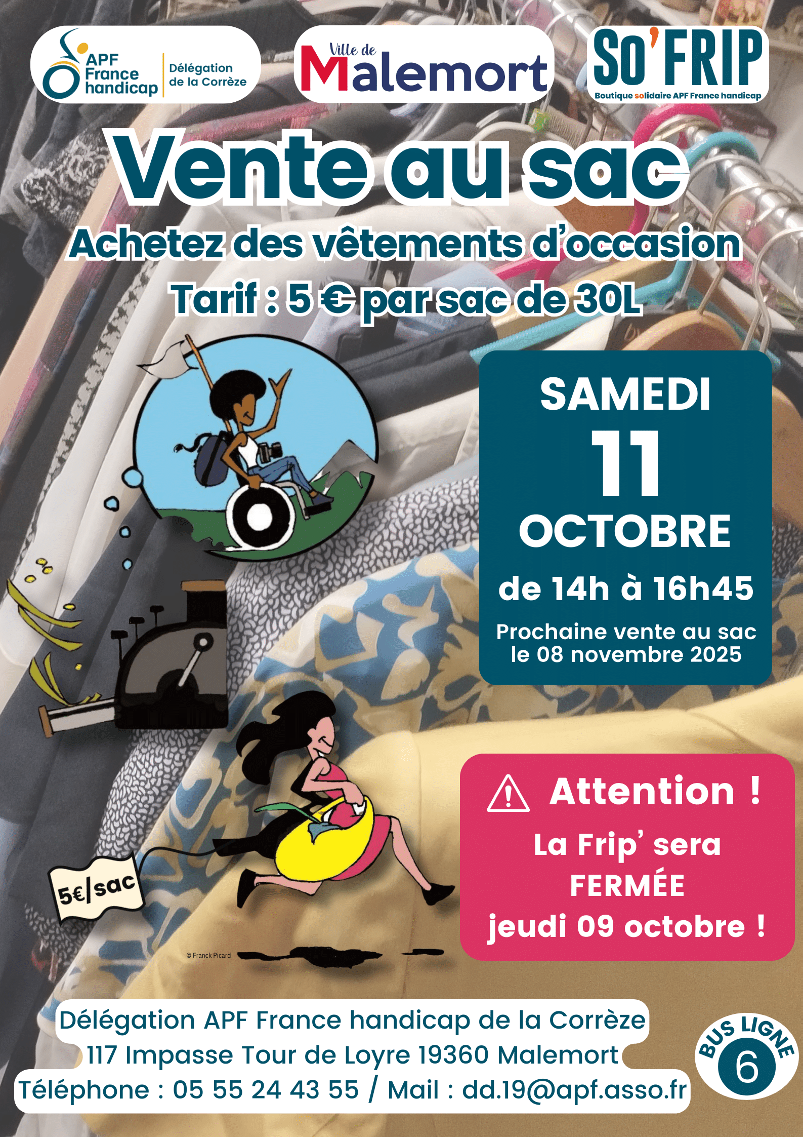 La boutique solidaire "So'Frip" de APF France handicap propose une vente exceptionnelle de ses vêtements à :